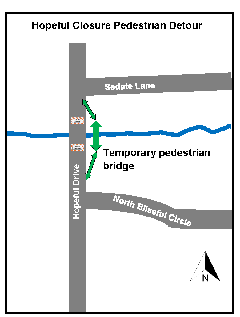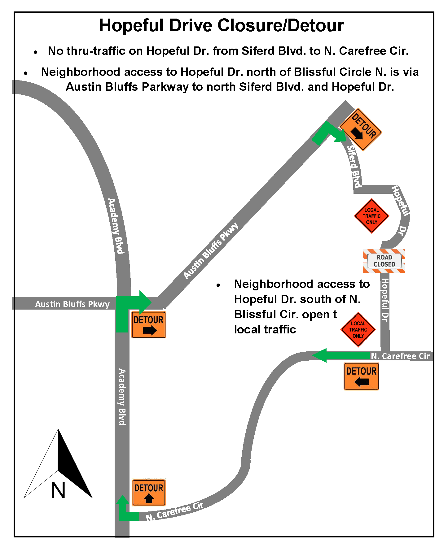 The multiple-month temporary closure of Hopeful Drive between Sedate Lane and North Blissful Circle has been scheduled to start the week of October 20.
