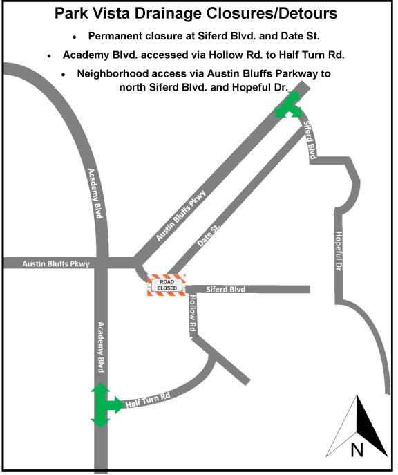 The City of Colorado Springs Stormwater Enterprise, in cooperation with El Paso County, is working to improve storm drainage in the Park Vista South Neighborhood. The improvements will address drainage and flooding issues that have historically impacted the Templeton Gap Floodway. El Paso County transferred ownership and maintenance of the Park Vista South area to the City of Colorado Springs. This transfer allows the City to streamline maintenance and flood mitigation efforts.