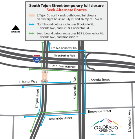 South Tejon Street, between East Motor Way and the Interstate 25 ramps, will close from Thursday, July 25 at 9 p.m. through Friday, July 26 at 5 a.m., and again Friday, July 26 at 9 p.m. through Saturday, July 27 at 5 a.m.